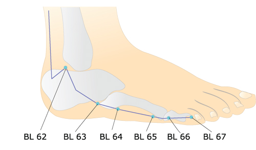 BL62 (Shenmai) is both the origin of the Yangqiao channel and the confluent point of the channel. BL62 is a Sun Si-Miao Ghost point. BL62 calms the spirit, benefits the head and eyes, regulates the Yangqiao channel, relaxes the muscle channels, quells internal wind, and expels exterior wind. BL62 is used for the treatment of insomnia, palpitations, mania, depression, fright, headaches, seizures, epilepsy, lower back pain, and neck pain.