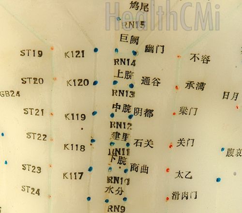 CV12 is the front Mu point of the Stomach, influential point of all yang organs and an intersection point of the Small Intestine, Triple Burner and Stomach channels. CV12 regulates Stomach qi and transforms and suppresses rebellious qi. Common indications for the use of CV12 include stomachache, hyperemesis, nausea, abdominal distention, diarrhea, indigestion, jaundice, gastric ulcers, acid reflux, mental illness affecting the stomach, mania and insomnia.