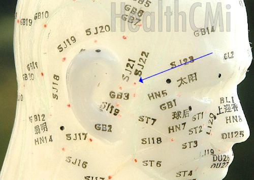 TB22 is located anterior and superior to TB21 and is level with the root of the auricle on the posterior border of the hairline of the temple where the superficial temporal artery passes. This point is approximately 0.5 cun anterior to the upper border of the root of the ear. There is a slight depression on the posterior border of the hairline of the temple where this point is located. SJ22 is the meeting point of the Sanjiao (Triple Burner), Gallbladder and Small Intestine channels. TB22 is an Exit point and is commonly used for the treatment of headaches, deviation of the mouth, head wind, tinnitus and lockjaw.