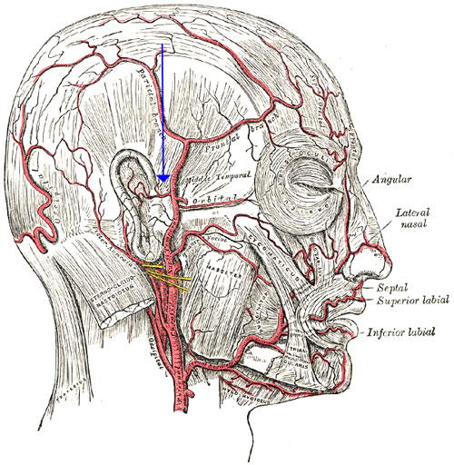 TB22 (SJ22) is needled obliquely at a depth of 0.1 to 0.3 inches according to some texts and is needled 0.3 to 0.5 cun transversely according to other texts. Avoid the superficial temporal artery at this location. TB22 is posterior to the superficial temporal artery. Palpate to locate the superficial (superior) temporal artery and the point is in the small depression posteriorly.